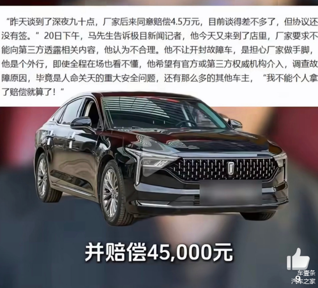 不过,事情却开始朝着更具争议的方向发展。在官方尚未公布技术调查结果的情况下,“赔偿”却先行一步。有媒体报道,厂家已介入处理,车主马先生向购车4S店提出退车退款及5万元精神损失赔偿诉求,经多轮沟通厂家同意退款并补偿4.5万元,涉事车辆也被贴封条禁止擅自挪动。