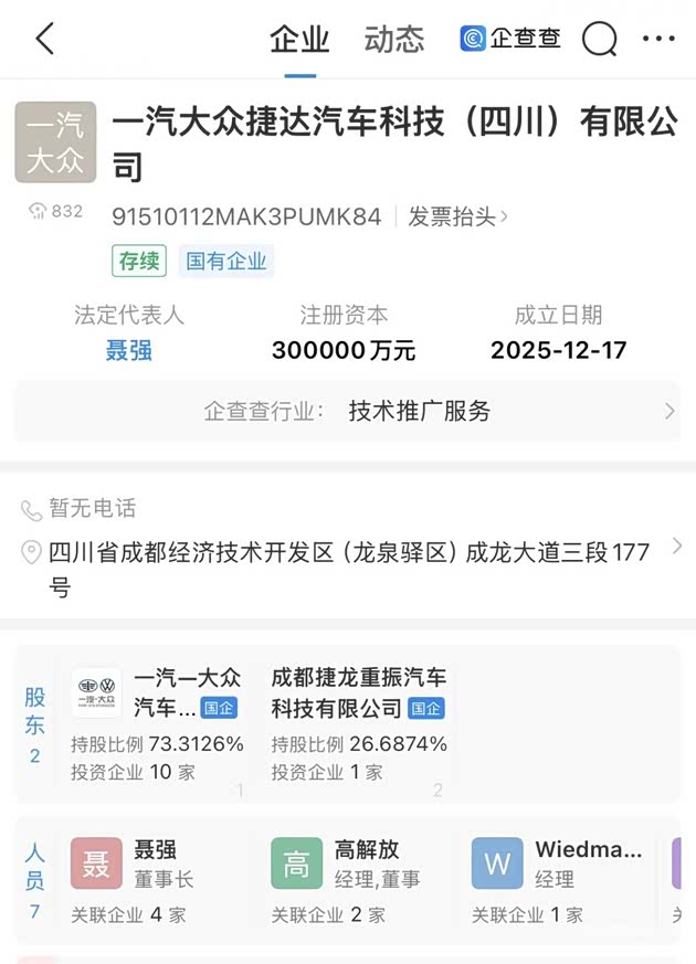 聂强此次出任法人的公司,全称为一汽大众捷达汽车科技(四川)有限公司,其股权结构体现了新的合作思路。该公司由一汽-大众汽车有限公司(持股73.3126%)与成都捷龙重振汽车科技有限公司(持股26.6874%)共同持股。成都捷龙重振由四川省、成都市及区级的国有产业投资基金联合成立,注册资本达51亿元。