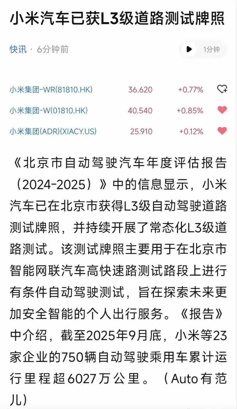 昨天小米拿到了北京L3级自动驾驶路测牌照,说明小米的智驾实力已经得到官方认可了,这对小米的人车家全生态来说直接就从被动响应到主动预判了,生态闭环就更完善了,毕竟汽车是整个小米生态中空间跨度最大、使用场景最复杂的硬件,L3的到来就把汽车手机家居全打通了,这才算真正意义上的全生态,对用户来说就直接全场景自动化了,这才刺激呢……