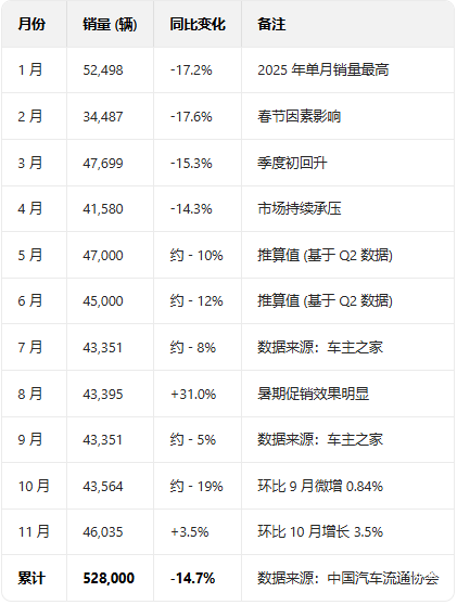 先看销量,国内销量今年以来,跌幅就非常不乐观,1-11月份,累计销量是52.8万辆,同比直接跌了14.7%,而全球销量累计是204.16万辆,这还是刨去国外的52.8万辆之后的成绩,仅仅只增长了1.8%,这个数字对于一家百年车企来说,情况是非常不乐观的,曾经的百年车企,中产们的象征,销量也开始走下坡路了。