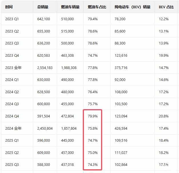 我们直接可以从销量上面就能看出来的,宝马的销量里面,燃油车的占比达到了惊人的75%以上,纯电车的占比,一直都维持在20%以下,对于宝马而言,这时候,尴尬的事情就出现了,的确高层里面很多人都能看出来未来电动化是大趋势,可燃油车的势力太大,宝马也头疼了,内部像一艘巨轮,调头的压力是非常大的。
