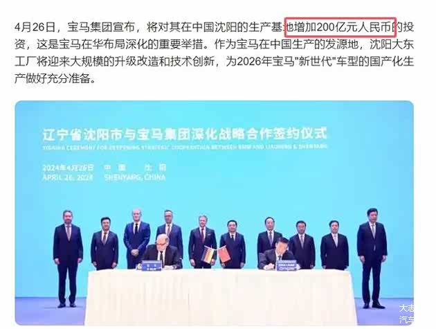 宝马难道就不知道吗?不,他们当然知道,甚至还很清楚,于是,我们可以看到一件事情,早在今年的4月份,宝马汽车就跟中国的沈阳签署了一份协议,砸了200个亿的资金,将全面开始升级沈阳制造工厂,什么概念?也就是说,宝马开始押注中国汽车市场了,并且明确了宝马接下来的战略了,那便是尽可能往中国市场靠拢。