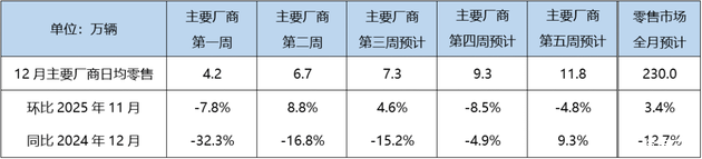 乘联分会发布了12月狭义乘用车零售预估数据。受11月以旧换新政策大面积调整影响,多数厂商对12月的销售预期趋于中性偏保守。其中,占市场总销量近八成的头部厂商,本月零售目标较11月持平或略有增长。初步预计,12月狭义乘用车零售市场规模约为230万辆,环比增长3.4%,同比下降12.7%。其中,新能源零售量预计为138万左右,渗透率预计可达60%。