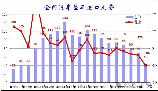 与此同时,中国进口豪华车市场连年萎缩。数据显示,进口车市场自2014年达到143万辆峰值后持续下行,2024年进口量已降至70万辆,同比下降12%。今年1-10月,我国进口汽车40万辆,同比下降30%,创近年同期最大跌幅。与之形成鲜明对比的是,国产高端品牌近年来持续增长。今年上半年,中国品牌乘用车销量占比达到68.5%,同比提升6.6个百分点;在30万元以上新能源乘用车市场,中国品牌占比已超过八成。