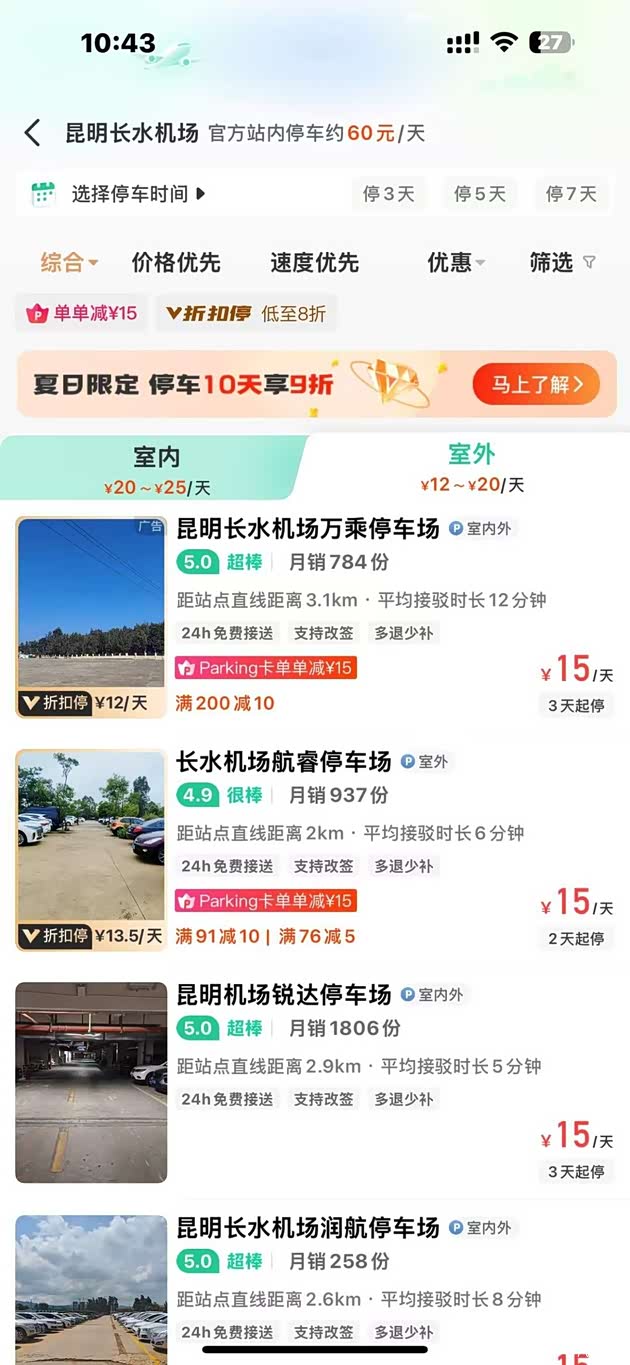 昆明机场虽位置较为偏远,可自驾前往却有着诸多便利。旅客能依照自身需求灵活规划出发时间,无需在等车、换乘上耗费精力,既节省了时间,又降低了交通成本,让整个旅程更加顺畅高效。不过,机场高昂的停车费一直令旅客苦恼不已,室内停车场一天最高收费达60元,室外也要40元,哪怕只是短暂停留,也会带来不小的经济负担。好在如今有了新选择!只需微信搜索【小强停车】,就能轻松预约机场周边的停车场。输入邀请码“58”,还能领取38元停车抵扣券。通过小强停车平台预约,周边停车场每天仅需12元,相较于官方停车场,至少能省下27元,节省比例高达67.5%!此外,这些停车场还提供贴心的接送服务,旅客再也不用在机场内四处寻找车位,轻松告别高昂停车费带来的烦恼。