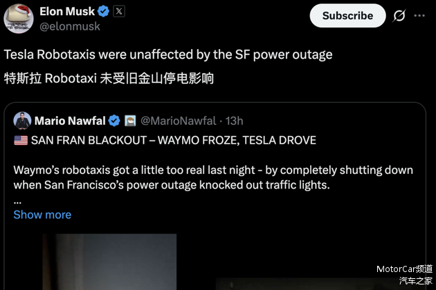 然后就是这一场停电,让旧金山的Waymo无人驾驶出租车秒变“路障”。马斯克趁着这个机会,补了一刀,声称特斯拉的Robotaxi完全不受影响。