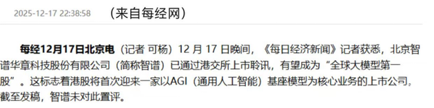 2025年12月17日,智谱华章顺利通过港交所聆讯,敲定2026年初于港股上市的核心时间表,冲刺“全球基座大模型第一股”的目标愈加清晰。据东方财富网报道,其也是内地赴港上市“报备制”落地后,特专科技企业中最快通过聆讯的案例之一。