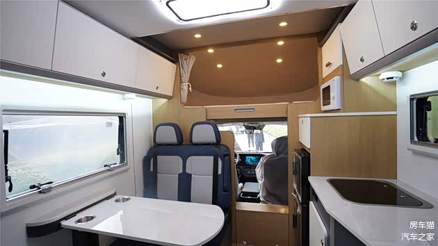 内饰设计温馨舒适,根据不同版本,车身材质有三明治(三胺纸)以及四明治+PET板材可选。生活区布局合理,采用对卡座沙发搭配卫生间和厨房吧台的设计,营造出家庭般的氛围。家具材质和色彩搭配协调,给人一种温馨的居家感。