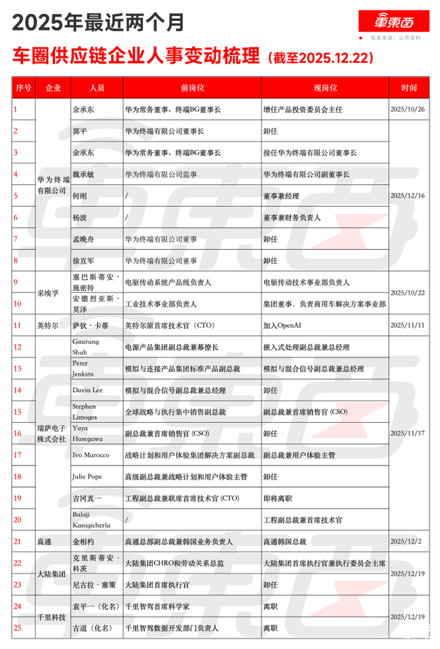 最近俩月新势力车企人事变动梳理(截至2025.12.22)