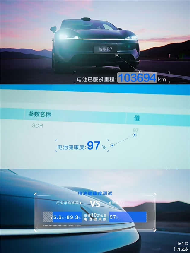 电动车主普遍关心的一个现实问题是:车辆使用五年或行驶十万公里后,电池衰减究竟如何?行业通常将电池健康度降至75%-80%视为性能临界点,而智界R7搭载的巨鲸电池在完成十万公里真实路况测试后,电池健康度仍保持在97%的高位,显著超越行业基准。
