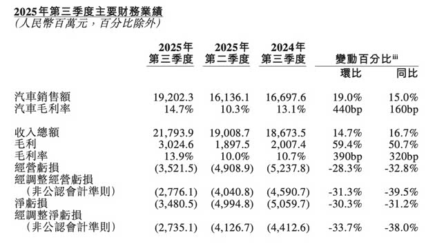 蔚来2025年第三季度营收为192亿元(26.973亿美元),较上年同期增长15%。第三季经营亏损35.215亿元(4.947亿美元),较上年同期下降32.8%;净亏损34.805亿元(4.889亿美元),较上年同期下降31.2%。