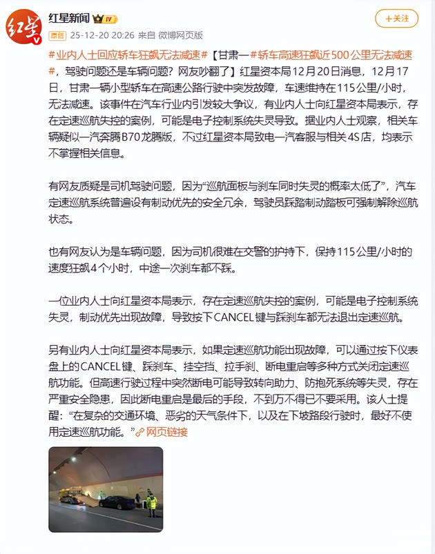 12月17日晚,G75兰海高速上那场持续四个半小时的“生死时速”,至今想起来仍让人脊背发凉。一辆轿车定速巡航疑似失灵、刹车失效,以115公里的时速一路狂奔,最终靠燃油耗尽才停下,全程多亏交警开道、路政压阵的“护航编队”,才没酿成更大悲剧。随着事件发酵,有消息称涉事车辆为 一汽奔腾B70,而奔腾汽车官方“正在调查”的回应,却让这场惊魂事件背后的汽车安全命题,变得愈发沉重。