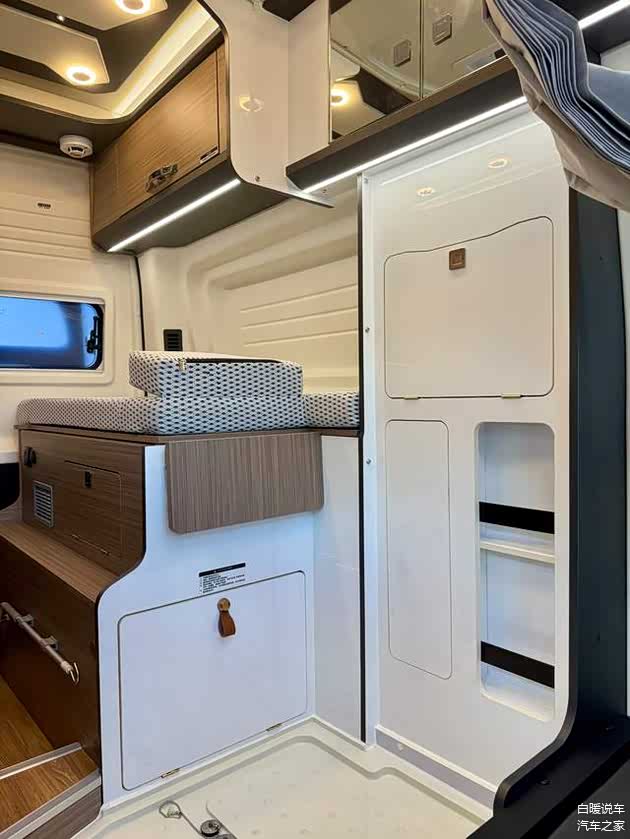 生活配套的全面性让旅居体验再升级。厨房区域配备102L双开门房车专用冰箱、镶嵌式电磁炉、微波炉与带盖专用水槽,翻折式扩展台面增加操作空间,满足日常烹饪需求;48V壁挂式空调与燃油暖风热水一体机,实现冬暖夏凉的舒适环境,配合全车加厚保温隔热降噪设计,隔绝外界寒暑与喧嚣。卫生间采用独立设计,双向换气扇、外置淋浴系统、便携式坐便器与卫浴组合柜一应俱全,75L净水箱与40L灰水箱的配置,让洗漱沐浴无需顾虑。