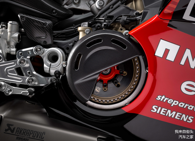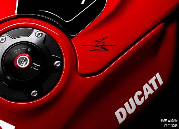 不止如此,在这台顶级限量版车型上,杜卡迪还为其配上了MotoGP级别的STM-EVO SBK干式离合,338.5mm超大Brembo T-Drive刹车碟搭配Brembo GP4 Sport组成的Brembo Pro+刹车系统,Akrapovič homologated轻量化排气、来自Öhlins的顶级避震系统DES 3.0、全碳纤维轮圈、专属 Alcantara坐垫以及大量碳纤维车体套件。