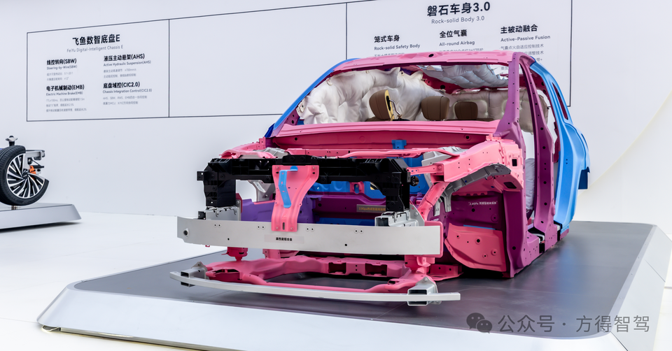 12. 线控转向、线控制动、后轮转向、磁流变悬架构成飞鱼底盘。