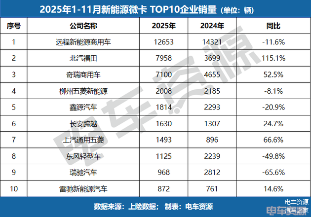 从1-11月微卡市场整体竞争格局来看,头部阵营呈“一超多强”,远程以1.26万辆累计销量领跑(同比微降),北汽福田异军突起(7958辆,同比+115.1%)。