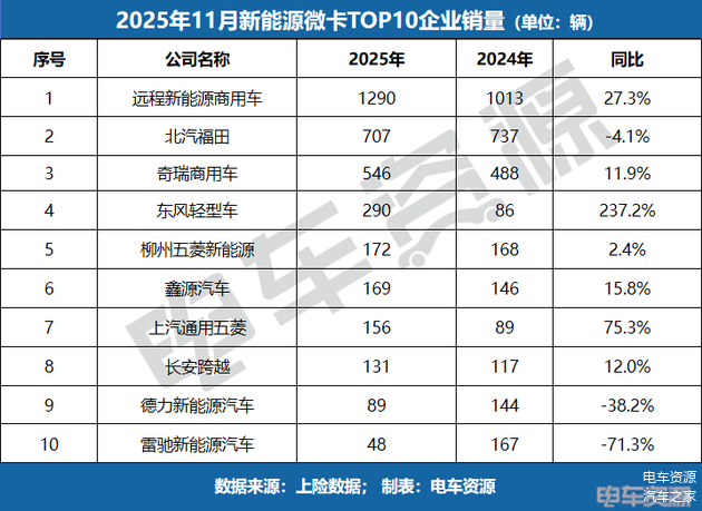 微卡细分市场的企业竞争格局来看,远程新能源商用车表现强势,11月以1290辆(同比+27.3%)的销量稳稳占据榜首位置,持续引领微卡市场发展。东风轻型车的表现尤为抢眼,凭借237.2%的大幅同比增长成功跻身行业前五,成为搅动市场格局的新兴力量。