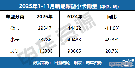 但1-11月累计数据呈现显著分化:小卡以7.38万辆销量占主导(同比+49.3%),成为整体增长核心引擎;微卡销量3.95万辆,(同比-11.0%)。