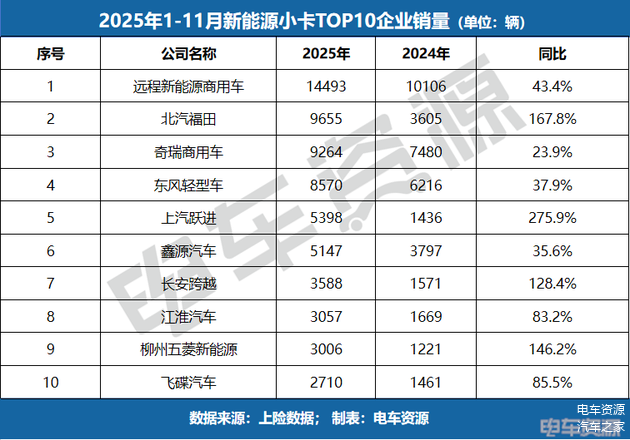 11月小卡市场竞争态势更为激烈,头部企业凭借强劲实力展现充足增长动能:远程新能源商用车以1570辆(同比+39.6%)的销量稳居月度销量榜首;北汽福田、长安跨越表现尤为亮眼,销量同比分别暴涨109.8%、165.7%,成为驱动月度市场增长的核心主力。