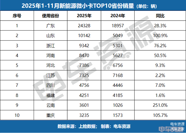 从1-11月区域分布维度来看,新能源微小卡市场需求呈现清晰的“沿海领跑、内陆崛起”格局,区域分布均衡化趋势愈发明显。其中,广东省以2.43万辆(同比+28.3%)的累计销量增幅稳居区域销量榜首;山东、浙江紧随其后分列二、三位,两省同比增幅均超70%,尤其是山东同比暴涨100.9%,已成为沿海地区市场增长的重要支撑极。