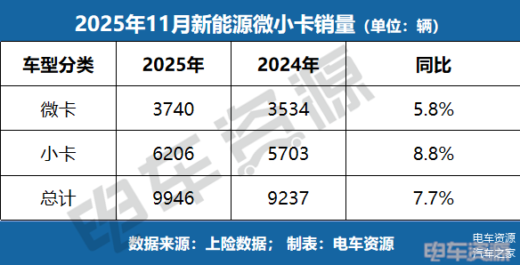 据电车资源统计数据:2025年11月新能源微小卡销量9946辆(同比+7.7%),延续向好势头。从细分车型销量表现来看,新能源微卡销量3740辆(同比+5.8%),小卡销量6206辆(同比+8.8%),两大细分市场彰显强劲韧性。