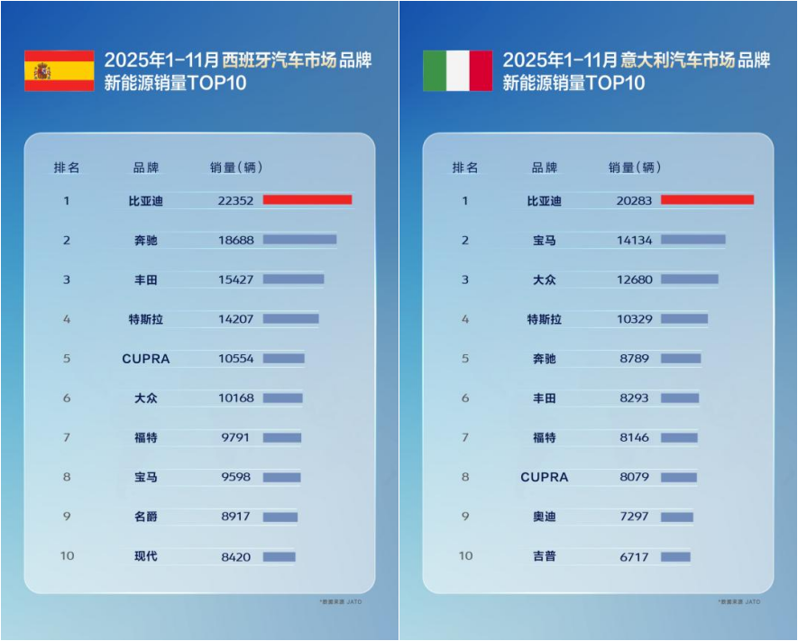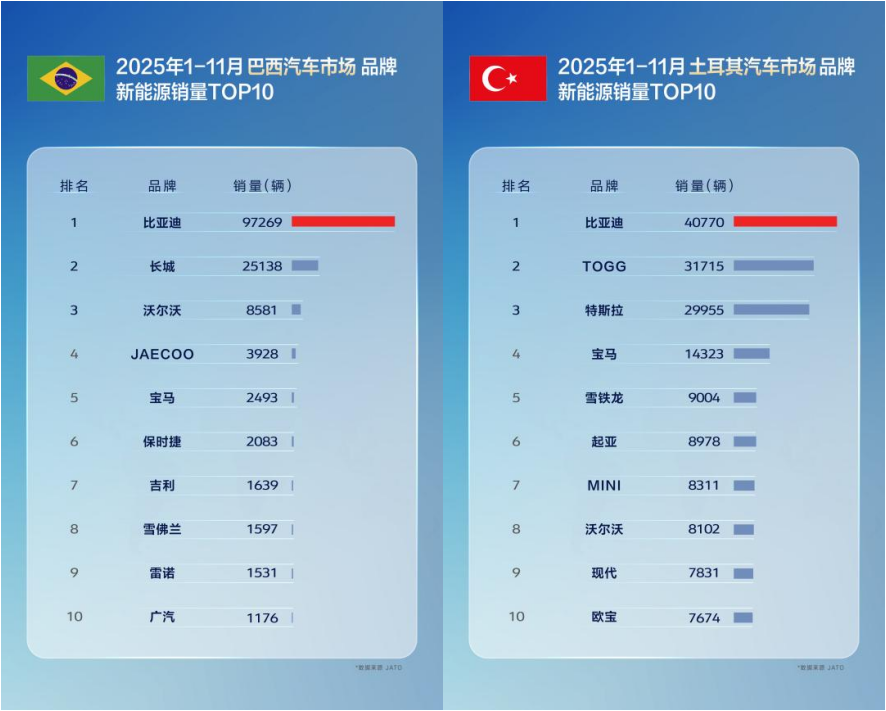 11月,比亚迪在巴西、土耳其、意大利、西班牙、匈牙利、克罗地亚等国拿下了新能源汽车销量第一,在新加坡等国家获得全品牌销冠。1-11月累计表现同样不俗,在巴西、土耳其、西班牙、意大利等国,比亚迪位列新能源汽车品牌销量榜首;在新加坡、中国香港等地区市场荣膺全品牌销量第一,备受消费者认可。