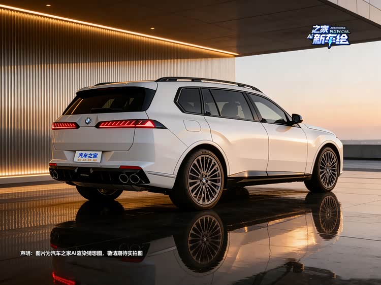 转到车身侧面,新车继续使用简洁的横向线条,后三角窗的造型有一定修改。值得一提的是,效果图中为X7配上了此前曾在新X5及部分概念车上出现过的、带有小风翼造型的门把手,为整车增添了一些细节上的灵动感。此外,为了强化运动观感,车身多处饰件采用了深色处理。车尾部分则借鉴了新款iX3的尾灯设计语言,与整车较为硬朗的造型风格形成呼应。
