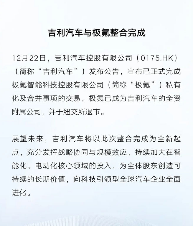 12月23日,吉利汽车控股有限公司(0175.HK)(简称“吉利汽车”)发布公告,宣布已正式完成极氪智能科技控股有限公司(简称“极氪”)私有化及合并事项的交易,极氪已成为吉利汽车的全资附属公司,并于纽交所退市。