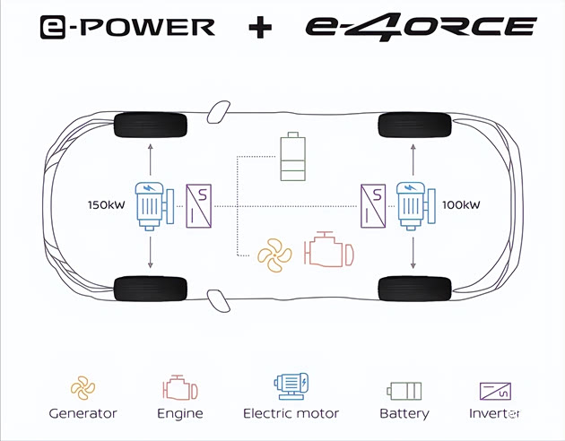 第四代日产X-Trail e-Power采用了e-4ORCE四驱系统,搭载1.5L Turbo三缸引擎,作为发电机,为1.8kWh电池组提供电力。
