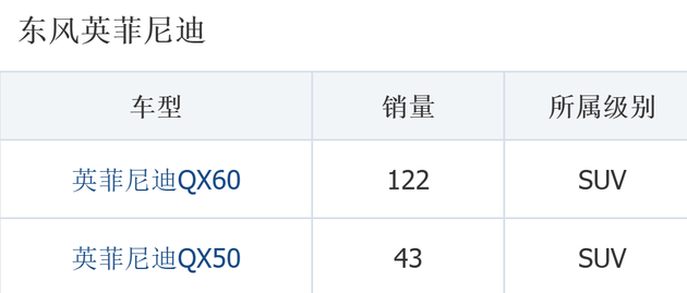 英菲尼迪11月销量是165辆,其中英菲尼迪QX60销量是122辆、英菲尼迪QX50销量是43辆。车型卖不动,一方面是因为现有车型改款迭代节奏慢、升级幅度小,另一方面是新增车型与市场需求脱节,配置跟不上时代步伐。