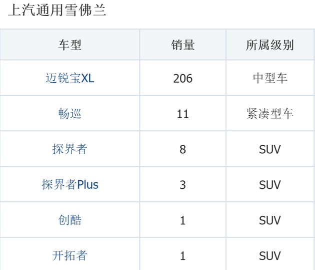雪佛兰在巅峰时期于国内月销量一度接近10万辆,可近半年品牌月销量只剩下几百台,今年11月累计卖出230台车,其中大部分销量由 迈锐宝XL一款车型所贡献,像雪佛兰创酷、雪佛兰开拓者一个月仅卖出去1台车,而探界者、探界者PLUS的11月销量分别是8台、3台。
