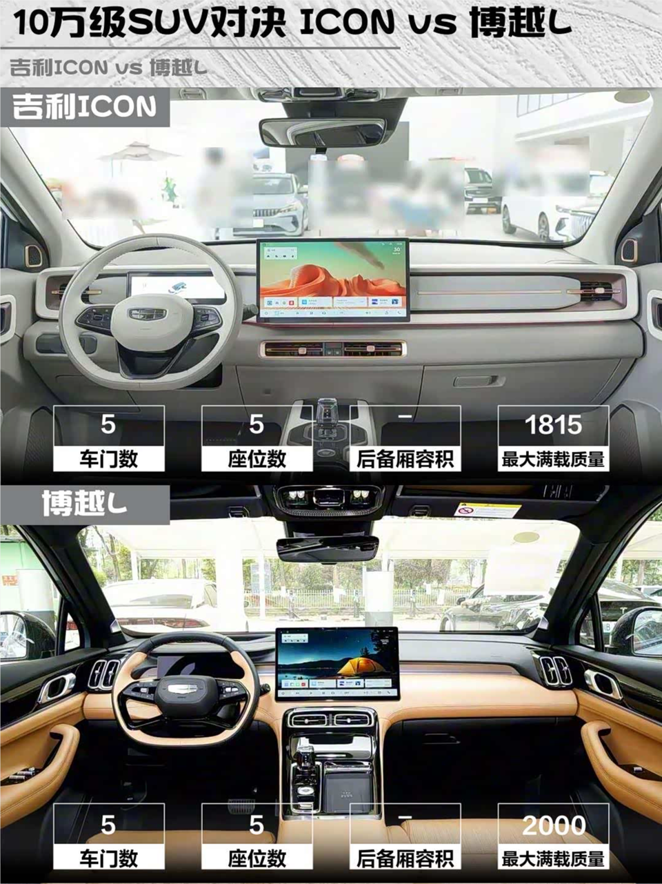 博越L完胜!4730mm车长比ICON长了近40cm,后排能跷二郎腿,后备箱650L超大容量。ICON虽然小巧(4350mm),但后排坐3个成年人也不挤,城市停车更方便。储物空间上博越L门板能塞1.5L大水壶,ICON的门板储物就有点捉急了...