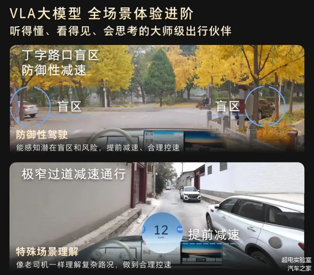 像端到端只能做到 “看见行人减速”,而 VLA 能面对尚未显现风险作出判断,比如途径临停大车,或被围挡遮挡的施工现场,它会推理出道路可能变窄或存在发生 “鬼探头” 的概率,从而提前减速、主动避让。