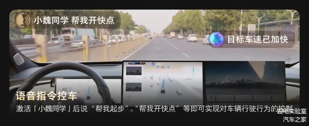 用户可以通过激活“小魏同学”语音助手,发出 “远离大车”、“开慢一点” 等口令完成车辆控制,道路拥堵怕被加塞,只需要说“跟近前车”,系统就会自动调节跟车时距,避免被加塞,出行效率更高,也可通过“帮我起步”来激活NOA。