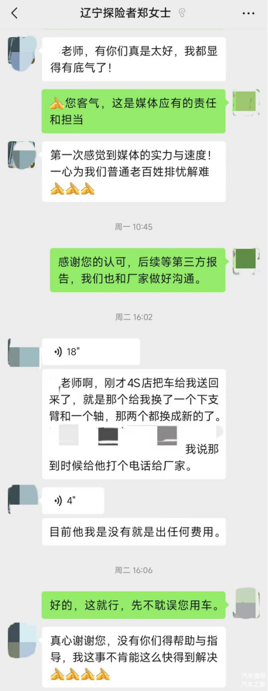 事情的原委是这样的:2025年12月11日早晨,郑女士的车辆在小区内启动时右前轮突然脱落,多次联系厂家未果,4S店救援也迟迟不到。陷入困境的她通过网络找到我们,而令她没有想到的是,仅仅72个小时,在汽车情报与厂家有关领导的持续沟通与协调下,厂商对此予以高度重视并迅速响应,4S店快速为其免费更换部件,车辆恢复正常使用,一场突如其来的行车危机就此化解。