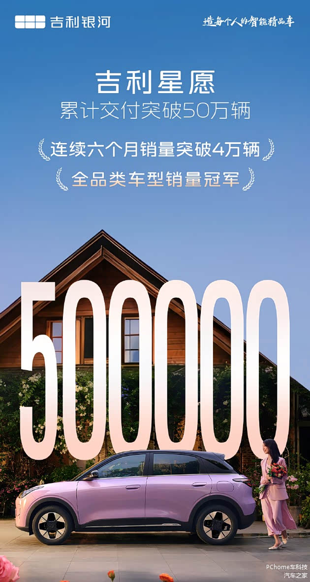 12月23日消息,吉利银河官方微博今日发布消息,吉利 星愿累计交付突破50万辆,连续6个月销量突破4万辆。吉利星愿成为2025年中国车市唯一交付超35万辆的车型,拿下202年全品类车型销量冠军。
