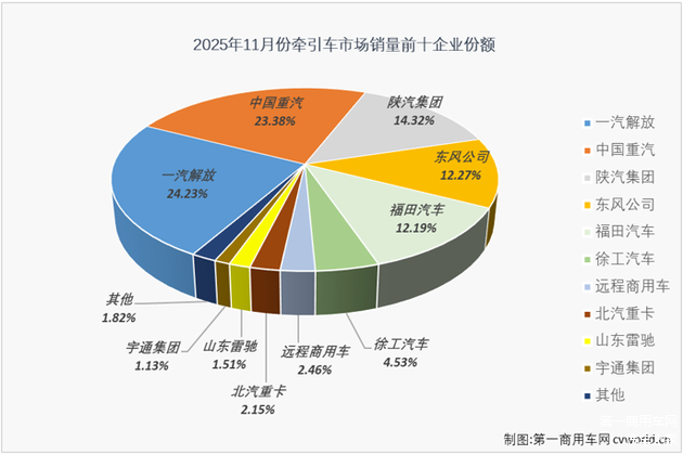 从行业格局看,与上月相比,2025年11月份牵引车市场行业前十成员保持不变,排名变化如下:东风与福田换位,东风上升一位至月榜第4位;远程与北汽重卡换位,远程上升一位至月榜第7位;排名月榜前3位的解放、重汽、陕汽,排名第6位的徐工,以及排名第9、10位的山东雷驰和宇通保持10月份排名不变。