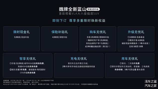 为让更多用户轻松拥有“为爱进阶”的出行体验,魏牌全新蓝山智能进阶版同步推出诚意十足的购车权益:限时现金礼:保险补贴礼:购车无忧礼(限2选1):充电无忧礼:升级无忧礼:智享无忧礼:用车无忧礼:限时焕新价已包含限时现金礼,保险补贴礼,购车无忧礼。