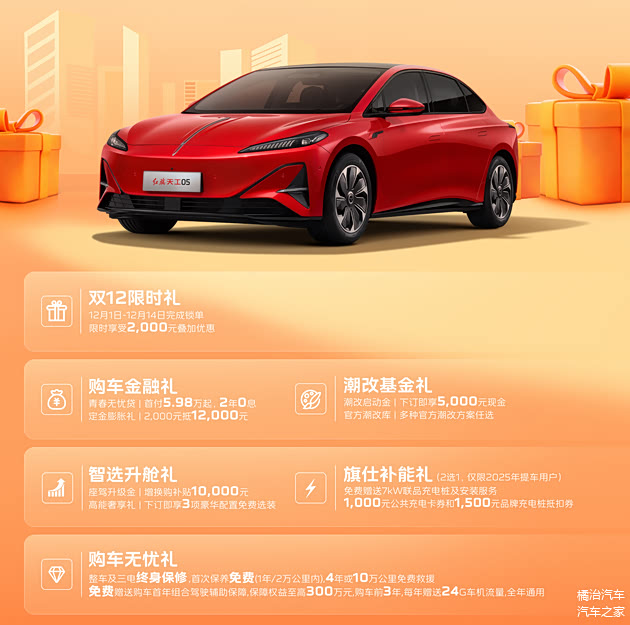 而且重点来了,2025年12月买红旗天工05,还有一堆福利,给大家梳理清楚:首付5.98万还能享2年0息贷款,定金最高能抵12000元;下订就送5000元现金潮改基金,想给车子整个专属风格的,直接用这笔钱选官方方案就行;要是想升级配置,还能享10000元升舱补贴,下订再送三项豪华配置;补能方面也不用愁,提车用户要么免费拿7kW充电桩+安装服务,要么选1000元公共充电卡券+1500元充电桩抵扣券;还有购车无忧保障,新车和三电终身保修、首次保养免费,4年/10万公里免费救援,前3年每年24G车载流量。不过要提醒一句,以上权益详情得咨询当地指定经销商,避免错过福利。