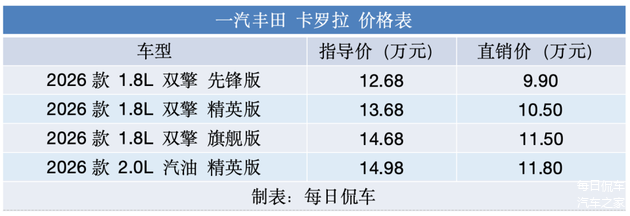 12月21日,一汽丰田推出了2026款 卡罗拉,共有四款车型,包括三款电混双擎和一款燃油版,指导价是12.68—14.98万元。这次厂家推出了直销价,是9.9—11.8万元。即日起至1月31日期间下定,还可限时享受4000元购置税补贴权益。新车在内外饰上有较大变化,风格上更接近新能源车,还加长了轴距带来更大后排空间,同时还升级了车机系统,用车体验有显著升级。