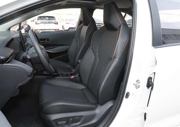 提供仿皮材质的一体化运动座椅,头枕与肩部的橙色缝线勾勒得很有型,坐垫与靠背都有不错的侧向支撑,填充物软硬适中,舒适感不错。中高配车型主驾提供电动调节,副驾为手动调节。