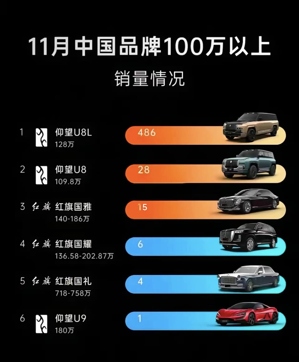 比亚迪最贵的车是仰望U9,专门用于对标保时捷、迈凯伦的超跑品牌,全款落地价超过211万,1-11月累计卖出94台,大家知道同一价格,国产车配置通常是外国车的两倍以上,仰望U9超强的1306匹马力,扭矩达到惊人的1680牛米,百公里加速做到2.36秒,这个性能比400多万的外国跑车还要强大。除了仰望U9,U8和U8L也上榜了,仰望U8L确实争气,落地超140万,11月销量居然高达486台。