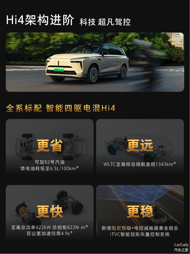 Hi4性能版,是全球首创的四挡全速域直驱技术。在路上的表现可概括为:跑得省、跑得远、跑得快、跑得稳。在4.9秒零百加速性能的同时,还能达成6.5L/100km的超低馈电油耗,更能带来1343km综合续航。并通过前后50:50轴荷分配与iTVC智能扭矩控制,为全家出行提供了从容安稳的驾乘体验。真正实现了“四驱的性能,两驱的花费”。