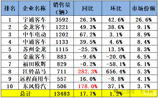 从月度销量排行来看,在销量前十企业中,宇通客车、金龙客车、中车电动、中通客车、江铃晶马、东风特汽,六家企业跑赢市场大盘,其中,同比增幅最高的是江铃晶马(增长282.3%)。
