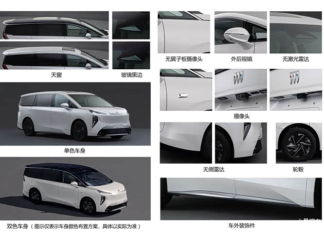 侧面造型方面,车顶略带一点弧度,线条感比较干练,双色车身还营造出了悬浮式车顶,属于目前MPV车型常见的设计语言;腰线采用了贯穿式设计,点缀出了车身侧面的层次感,门把手则是弹出式造型,能够起到降低风阻的作用;轮眉和侧裙部分设计有隆起的筋线,凸显了肌肉感;轮毂则是五辐式双色造型,风格比较大气。