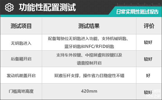 对于消费者来说,门槛离地高度一定程度上决定了上下车便利性。根据实测结果来看,评测车的门槛离地高度为420mm,成绩处于同级别车型中上游水平。