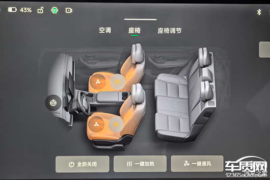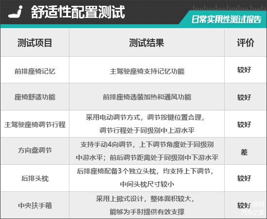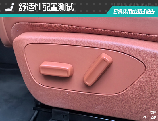 舒适性配置方面,评测车的前排座椅调节按键分别位于主/副驾座椅左右两侧,位置合理且操作便捷。功能方面,前排座椅选装了加热和通风功能,舒适性表现基本令人满意。