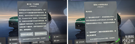 经过实测,评测车无法识别指着副驾车窗说“打开这个”、我有点饿了以及我有点不太舒服三条固定语音指令,对于其他语音指令均可识别并执行。具体来看,对于“导航到北京站东街”这样容易混淆的复杂指令,系统可以排除干扰正确理解;同时,当提出“导航到附近大众点评得分4.5分以上的川菜馆”的指令时,系统也能够进行精确筛选。除此之外,评测车在智能交互方面的表现也十分亮眼,无论是“请介绍一下车质网”还是“零跑C10都有哪些亮点?哪款配置性价比最高?”,系统都能给予丰富的内容反馈。此外,评测车还支持双区域语音唤醒识别、语音免唤醒词、语音连续识别以及可见即可说等功能,日常使用十分方便。