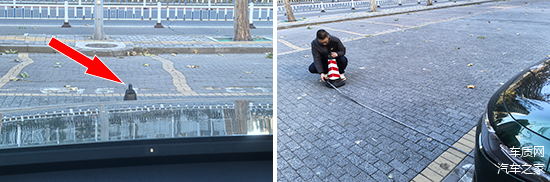 后方视野测试中,依旧将桩桶固定摆放,随后移动车辆直至可以观察到桩桶上沿为止。评测车后方视野所测得的距离为11.056m,在测试过的同级别车型中处于中上游水平。