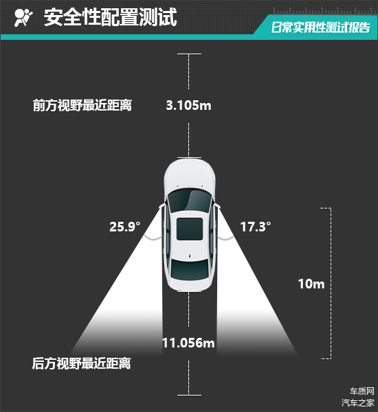 在车辆前、后方视野测试中,车内所有座椅均已调整至最低状态,所测出的数据与驾驶者正常使用时均有一些偏差,仅供参考。
